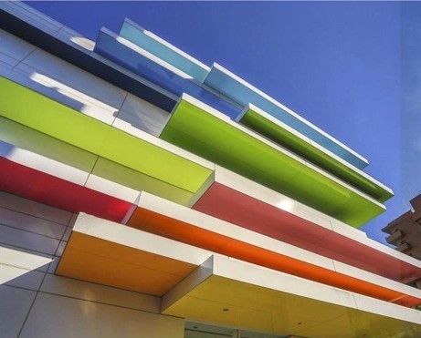 Tämä luo dynaamisen ja huomiota herättävän julkisivun, jonka ulkonäkö muuttuu valon ja katselukulman mukaan.