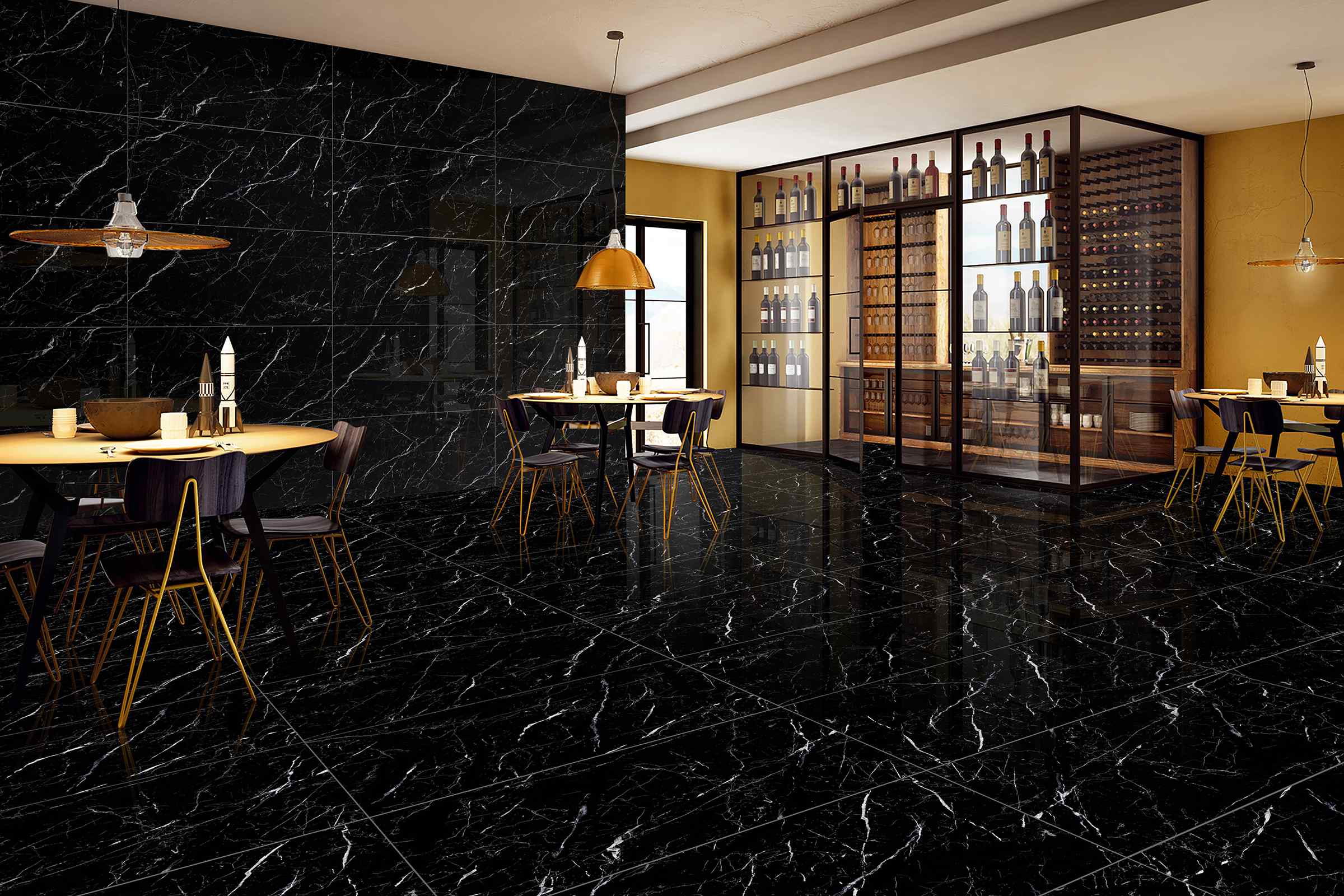 Simba Black kiiltävässä posliinilaatassa on syvä musta marmorikuvio ja hienovarainen valkoinen suoneistus.